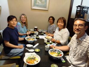 The KSGG members taught Japanese conversation to the parents of Saint Maur International School in Japan while enjoying soba, Japanese buckwheat noodles together at a traditional soba restaurant. They are from the UK, the US, and China, all living in Japan. Everyone arrived on time in front of the restaurant, and they went up to the second floor. They then began a conversation by introducing themselves and spent two enjoyable hours together.