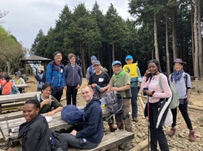 前日の雨も収まり、曇天ながらむしろ快適な気温で、ノーショー の2人を除き10人が予定通り到着。余裕で8:55発 直行バスに乗車した。今回は新潟や埼玉といった地方や都内からのゲストが多かったが、装備不足もなく大山丹沢フリーパスBを携帯にインストールした参加者もあった。追分社でストレッチの後、2班に分けて歩き出したが、アフリカ系の女性2名が長い階段の連続に徐々に疲れを見せ始め、下社前では最後の85段を諦めて待ってもらった。ゲスト5名ずつに2~3人のガイドが付く形でコミュニケーションも進んだ。ランチタイムで交流した後、二重滝→見晴台→勝五郎地蔵→九十九曲りを会話を楽しみつつ踏破し、浄発願寺三重塔を眺めた後、日向薬師トイレに到着。休憩していると、椎茸茶の差し入れを受け皆喜んでいた。アンケート実施後 、宝城坊茅葺屋根を眺め、16:20ごろ日向薬師バス停に着いた。参加者も、fun、great、thrilling、nice trip、enjoyable などの感想を寄せてくれ、紅葉ハイクが楽しみとの声も聞かれた。
