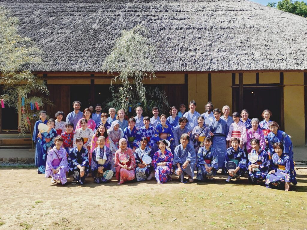 みんなの祈りが通じてか?当日は梅雨とは思えない青空と猛暑の中、恒例のゆかた会を実施した。今年度も午前と午後と2部制にした。それぞれ、ゆかたを着て短冊に願いを書いて笹に吊るし、七夕祭りの説明後、尺八伴奏で「たなばたさま」を合唱した。その後、お盆と盆踊りの説明をし、庭園で盆踊り(東京音頭・炭坑節)を踊った。自由時間に竹林や大塚歳勝土遺跡でスナップ写真を撮り、着替えて終りの会というスケジュールだった。去年の反省を踏まえ、着付けの部屋が混み合わないように着付け担当をシフト制にしたおかげで、着替えがゆったりでき、また短冊作りをする板の間も人数の割にはゆったりとしており、ゲストとコミュニケーションをとる時間が増えた。ゲストの皆さんは、ゆかたに着替えて写真を撮ったり、短冊を書いたり、みんなで輪になって盆踊りをしたり、短い時間であったが日本の夏を満喫していたようだった。