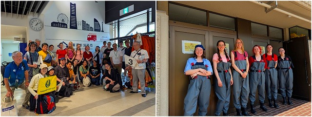 最後は、水災害体験。胸まで覆った長靴の防水ズボンを身に着け準備完了。屋外の体験施設に移動し、40cmほど冠水したドアの押し開け、水の流れに逆らう歩行に挑戦し、真剣かつ楽しみながら体験を終えた。みんなが興味を持ったのがコスチューム、お互いの勇姿を撮りあい、大いに盛り上がった。「日本人はみんなこの防水ズボンを持っている?」と驚きの質問が。