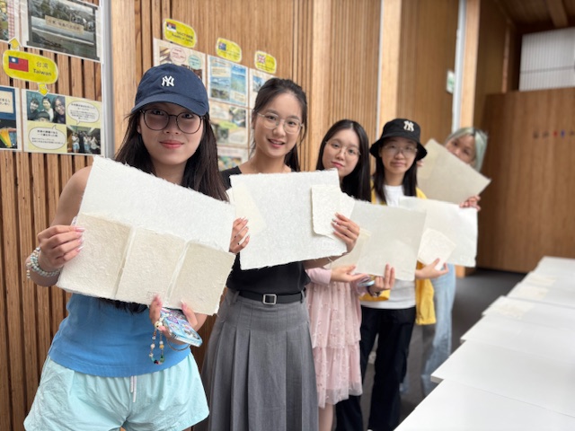 作業の成果は、3枚のハガキと、半紙大の和紙が完成。週明けには、自分たちが漉いた和紙を、自分の手で乾燥板からはがすという、ドキドキタイムも!(写真参照) 朝からの会場の設定や器材やバケツで水の搬送など、重労働ではあったが、留学生たちの笑顔に心は軽く帰路についた。