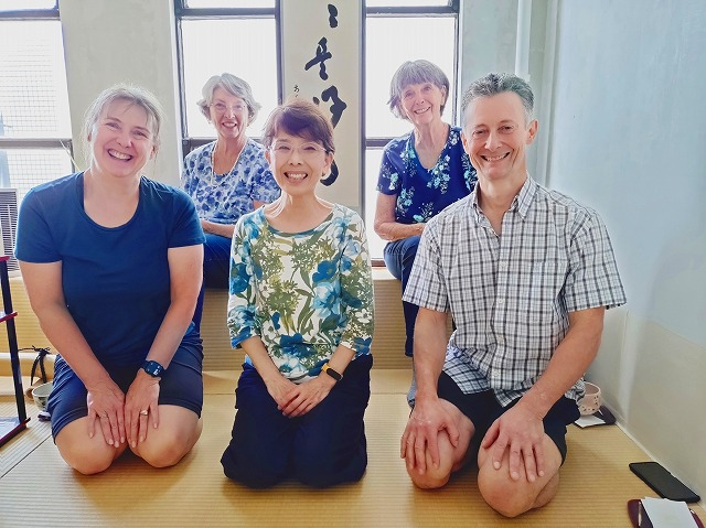 場所は県民ホールの裏の通りを挟んだところにある築100年のビルの4階。洋風建築の1室なのだが、にじり口をくぐるとそこは4畳半の茶室。床の間はないが窓際に「日々是好日」の掛け軸が掛り、竹の花入れに茶花が飾られている。亭主がまずはお菓子を運んでくださり、その後1人1人に異なる趣の茶碗でお茶を点ててくださった。お菓子屋さんのこだわりで同じものを2個以上は作らないとのことで、5人とも違うお菓子をいただき、マナーを守りおいしくお茶を召し上がり、棗(なつめ)と茶杓(ちゃしゃく)も拝見し、掛け軸と茶花も愛で、本格的な茶道体験に大満足の4人であった。