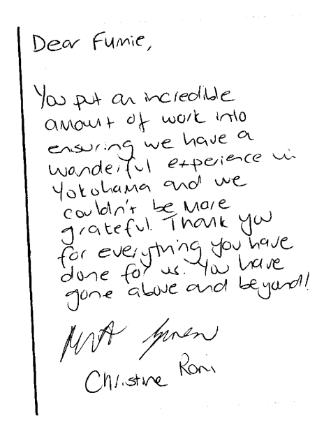 その後山下公園を通り中華街でランチを食べ、スーツケースをピックアップして大さん橋に。短い時間ではあったが、横浜の歴史地区をとても気に入ってくださり、何よりも楽しみにしていた茶道体験にとても満足してくださった。