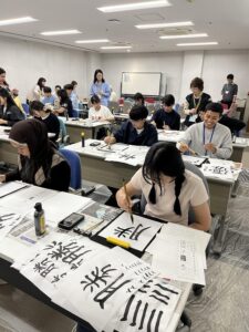 リーダーによる書道道具や筆の持ち方等の説明の後、生徒たちが選んだ漢字をデモンストレーション。ひと筆ひと筆に感嘆の声。書道への関心が感じられ、うれししく思った。基本の筆運びに慣れたころ、好きな漢字を選んでもらい半紙に練習。分からない所は積極的に質問し、本番の色紙に書く時には、驚くほど上手になっていた。緊張しながらも丁寧に書き上げ個性のある素晴らしい作品が完成した。最後は色紙を手に記念撮影。明るく爽やかな笑顔が印象的だった。