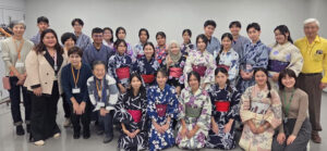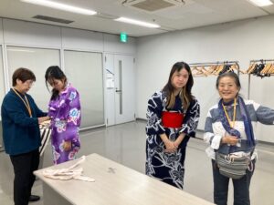 部屋には畳や敷物がなく、靴を履いたままの着付けとなった。女性の生徒たちは並べられた着物を見ると、早速着物や帯選びを楽しんでいた。中には自分の肌の色に合う着物を探している生徒もいた。着付けの後、みなで髪を整えたり化粧直しをしたりと、若い女の子らしい一面も見せてもらった。大きさ、形状や長さの異なるゆかた、帯、腰紐が用意されていたため、臨機応変に対応しなければならなかったが、メンバーで助け合いながら楽しく取り組むことができた。男性の部屋では、T会員がゆかた着用のデモンストレーションをした後に、彼らにもゆかたを着てもらう方法でスムーズに進行した。