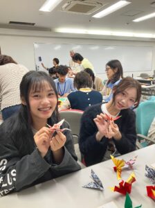「鶴」、「羽ばたく鶴」、「寿鶴」の3種類を用意したが、まず高校生が喜びそうで短い指導時間でも出来上がる「羽ばたく鶴」を作ってもらうことにした。3テーブルに分かれ、手元を見せながら一緒に折っていった。出来上がって、羽ばたかせてみると、すぐにパタパタと羽ばたいて歓声をあげる人、片方の翼だけが動く人、全く動かない人と出来上がりはさまざま。開き具合をちょっと調整してあげるとどうにかみんな羽ばたいた。ホッとして喜び、友達同士で羽ばたかせ合って楽しんだりと、まだまだかわいい高校生の姿が見られた。金と赤の折り紙で作る「寿鶴」は、指導までの待ち時間に会員が作っておき、折り紙の美しさを知ってもらい、時間があった高校生には折り方を教えた。今回、タイ語クラブの会員が、事前の折り方の練習時から参加、本番は同時通訳もと大活躍だった。