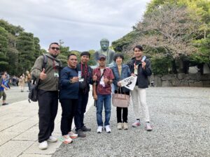 今年度2回目のAOTS研修生鎌倉ガイドであったが、いつもであれば英語によるガイドが半数を占めるが今回はなくやさしい日本語、インドネシア語そしてタイ語のこぢんまりとしたガイドになった。11月初旬ということで紅葉も始まり、鶴岡八幡宮では七五三を祝う家族や、舞殿で結婚式を挙げているカップルもいて、日本の習慣や文化を目の当たりにしてもらえたであろう。午後になると旅行者の数が増えて、江ノ電は満員で高徳院までの道も人で溢れていた。3連休ということもあったが、鎌倉は来るたびに混雑がひどくなっているように感じる。最後はいつものように由比ガ浜へ出て、海辺でリラックスしてもらったが、残念ながら風が強くなってきてゆったりしてもらえる天候ではなくなった。しかし、そこは若者達で風にも負けず楽しそうにはしゃいでくれていたのが幸いであった。