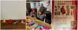 今回の「2025かながわ日中友好フェスタ」では、中国語のC先生、H会員を始めとする実践中国語倶楽部の皆様にご協力いただいた。当日は、約30の団体の展示、アトラクション、物販コーナーなど盛況で、私たち折り紙チームは、三種類の鶴の折り方を用意して午前のアトラクション/文化体験に参加した。