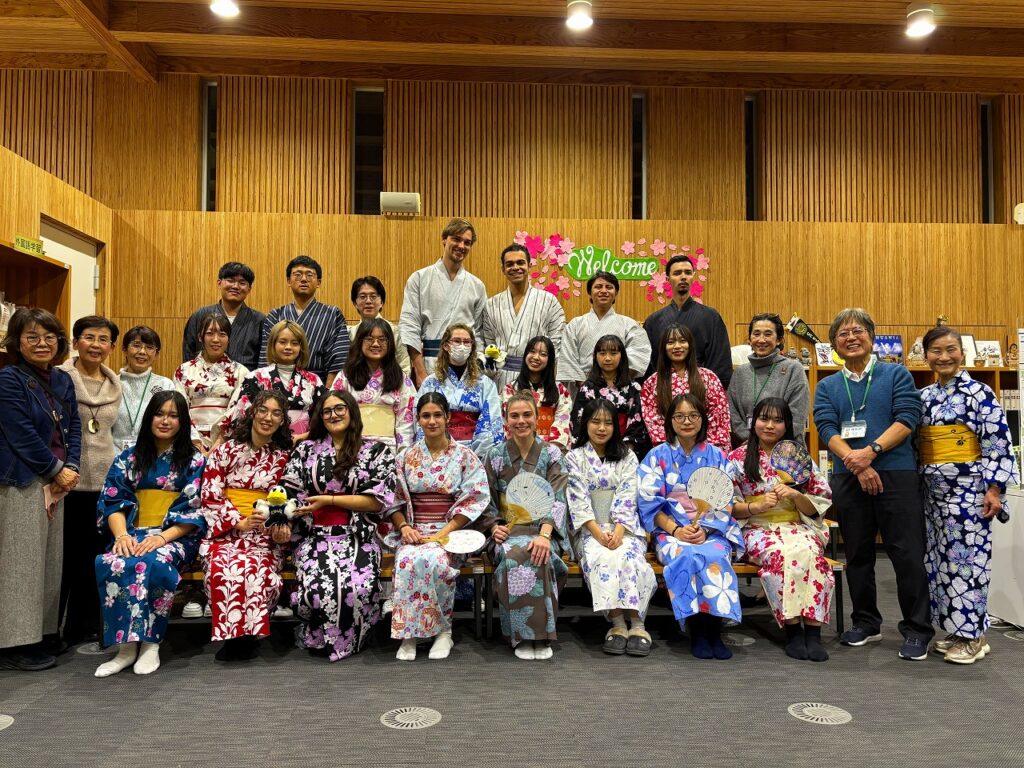 神奈川大学・2025年 後学期講座として、ゆかたの着付けレクチャーを実施した。まず「ゆかたと着物について」の英語によるPPTプレゼンテーション、次に男性・女性の順番で「ゆかた着付け方法を英語でデモンストレーション」と進行し、最後に学生自身が着付け体験をした。今回から大きくプレゼン内容と方法を刷新した。